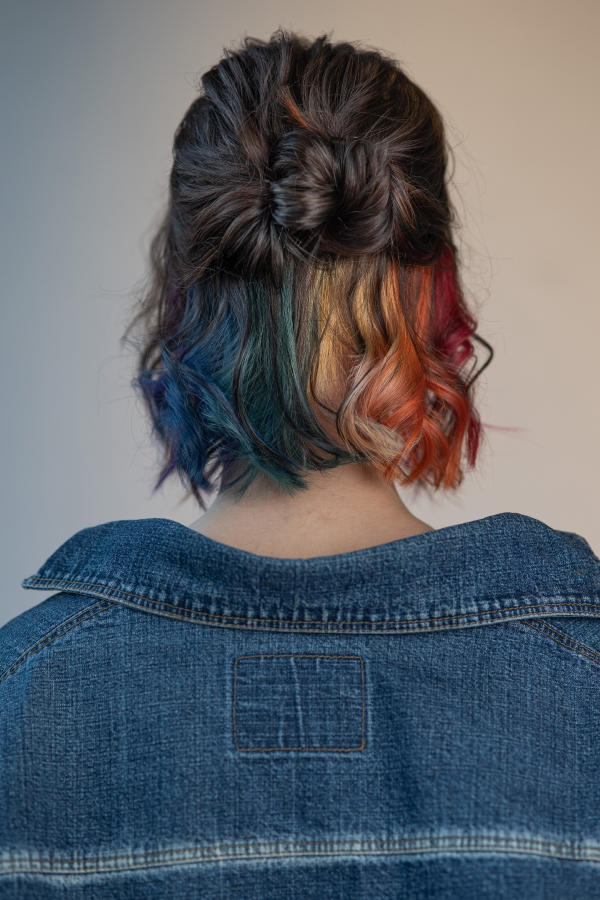 Deze leuke dame genaamd Lisanne mag ik Mandy keer op keer een make-over geven. Van kort naar lang en dan weer naar kort, curtain bangss, toffe kleuren niets is Lisanne te gek! Dit keer ben ik voor een hidden color in regenboog kleuren gegaan van Alterego. De nekpartij is hiervoor ontkleurd om de kleuren feller uit te laten komen en in de scalp heeft een mooie donkere tint. Wat ik volgende keer bij Lisanne ga doen? Dat is steeds weer een verrassing.